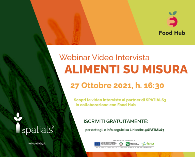 Mercoledì 27 ottobre 2021 alle ore 16:30 si svolgerà il #Webinar Video-Intervista “ALIMENTI SU MISURA”, la prima video-interviste dell’Hub SPATIALS3 in collaborazione con Food Hub